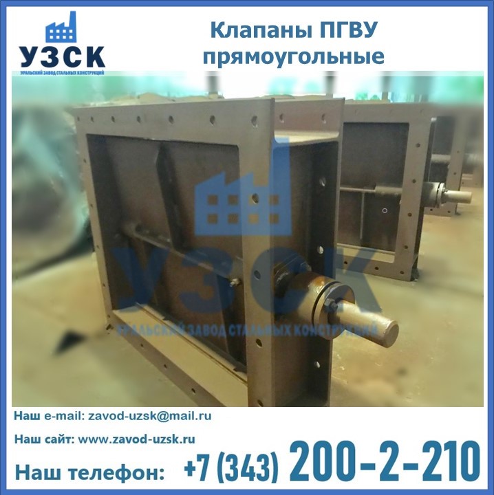 Прямоугольный клапан ПГВУ имеет прямоугольную или квадратную форму, по основному сечению конструкции, на которую устанавливается клапан. Для изготовления в Щучинске применяются сталь или чугун, в зависимости от модели. Внутри клапана имеется запорный элемент, передвигающийся параллельно общему потоку движения среды. Шибер ПГВУ имеет такую же форму, как и основное сечение. Перемещение створки происходит благодаря возвратно-поступательным движениям.